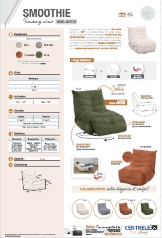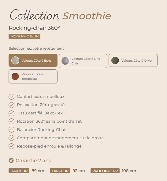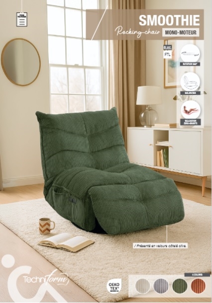 Découvrez notre fauteuil mono-moteur Smoothie pivotant à 360°, un véritable bijoux de design alliant confort et praticité. Avec sa silhouette moderne et ses lignes épurées, ce fauteuil s'intègre parfaitement dans tous les intérieurs, qu'il s'agisse d'un salon, d'un bureau ou même d'une chambre. Le fauteuil Smoothie offre également une expérience de relaxation inégalée grâce à son assise spacieux et son soutien optimal.